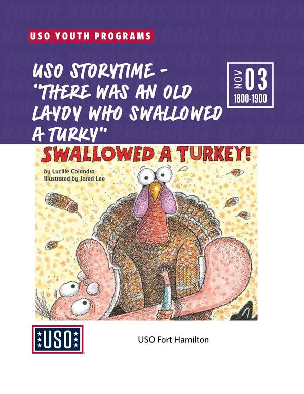 Join the USO as we read “There was an Old Lady Who Swallowed a Turkey!”. The event is geared toward children between the ages of four and seven, but children of all ages are welcome to participate. We will have a guest reader, a craft focused around the story, and a snack! Each family will receive a copy of the month’s book to take home!