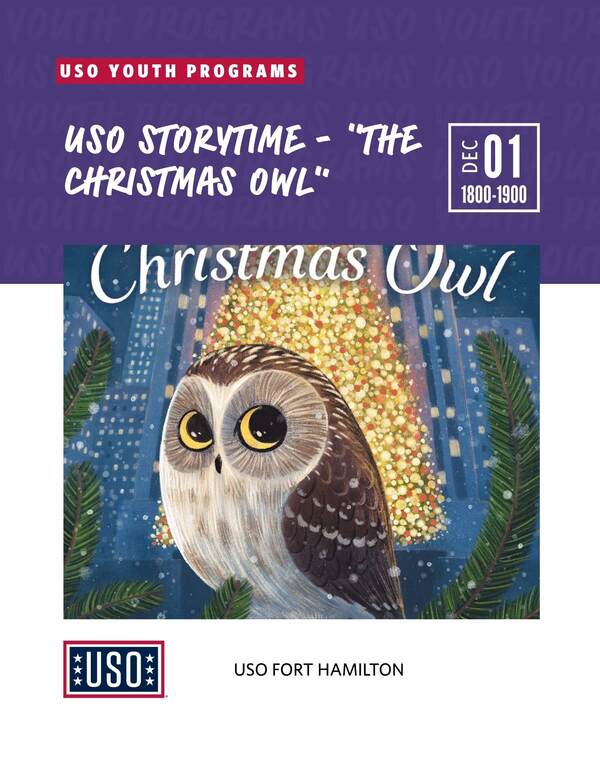 Join the USO as we read “The Christmas Owl”. The event is geared toward children between the ages of four and seven, but children of all ages are welcome to participate. We will have a guest reader, a craft focused around the story, and a snack! Each family will receive a copy of the month’s book to take home!