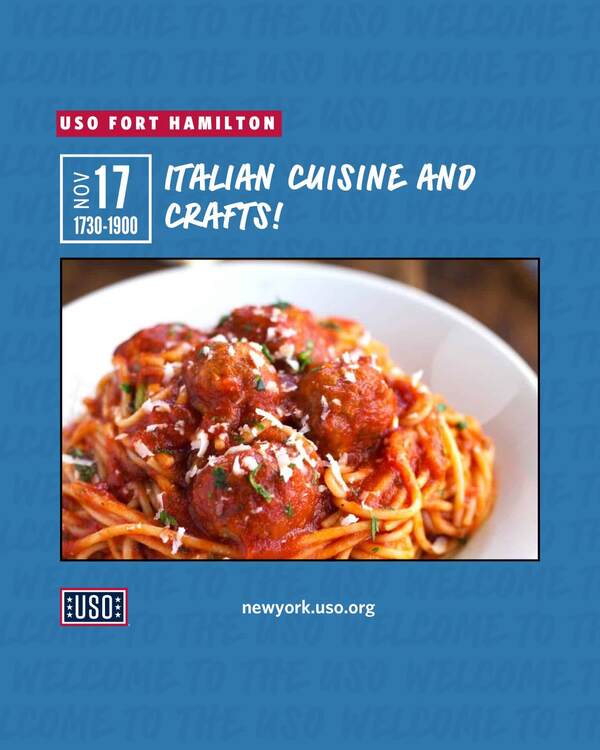 USO Fort Hamilton is hosting an Italian Dinner and Crafts evening featuring spaghetti and meatballs and holiday craft making for all active-duty military and their immediate families! You must be registered to attend.