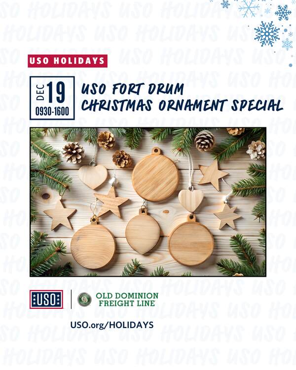 Join us at your Fort Drum USO Center and decorate a special Christmas ornament for your loved ones! We’ll bring the ornaments, paints, and so on–you bring the creativity! We’ll have hot chocolate and cookies to keep you warm, and when you get done you and your fellow artists can take a picture with your masterpieces in front of our holiday-themed Selfie Wall!