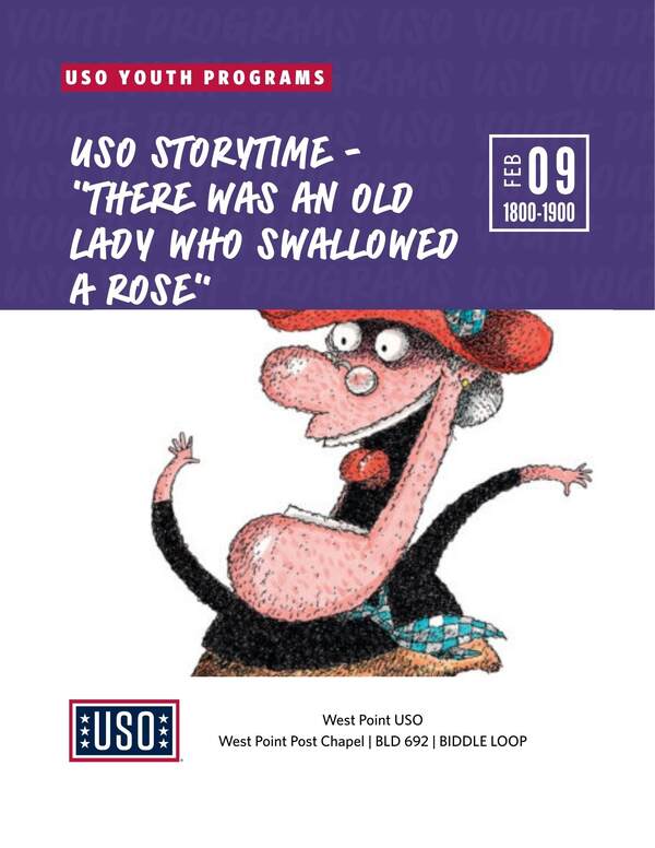 Join the USO as we read “There was an Old Lady Who Swallowed a Rose". The event is geared toward children between the ages of four and seven, but children of all ages are welcome to participate. We will have a guest reader, a craft focused around th…