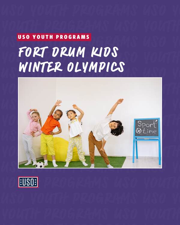 Kids are invited to represent their families and neighborhoods in our inaugural USO Fort Drum Kids’ Winter Olympics! Events will include Cornhole Toss, Paper Plane Launch, Cup Stack Challenges, Bottle Flips, and the Cookie Crawl! We’ll also have tas…