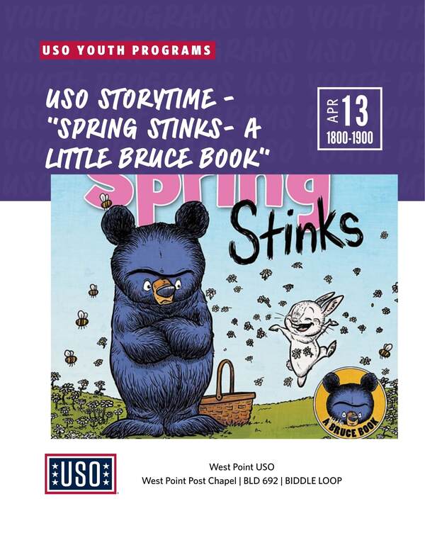 Join the USO as we read “Spring Stinks - A Little Bruce Book". The event is geared toward children between the ages of four and seven, but children of all ages are welcome to participate. We will have a guest reader, a craft focused around the story, and a snack! Each family will receive a copy of the month’s book to take home!
