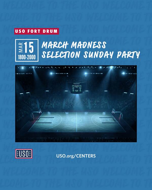Join us at your Fort Drum USO center as we kick off March Madness with our 2026 Selection Sunday party! Registered guests will be able to fill out brackets as part of our USO Fort Drum team. We’ll also have snacks and refreshments for everyone. And as March Madness rolls along, we’ll be playing the biggest games throughout the week in our center. We look forward to seeing you!