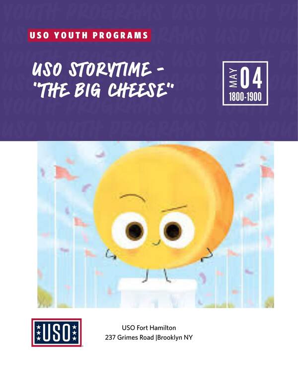 Join the USO as we read “The Big Cheese". The event is geared toward children between the ages of four and seven, but children of all ages are welcome to participate. We will have a guest reader, a craft focused around the story, and a snack! Each family will receive a copy of the month’s book to take home!