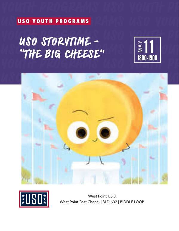 Join the USO as we read “The Big Cheese". The event is geared toward children between the ages of four and seven, but children of all ages are welcome to participate. We will have a guest reader, a craft focused around the story, and a snack! Each f…
