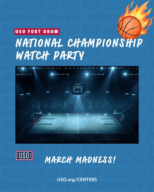 Join us at your Fort Drum USO Center as we culminate March Madness with a special National Championship watch party! Bring in your brackets, wear your swag, enjoy (soft) drinks and snacks, and celebrate the biggest game of College hoops of the year with us!