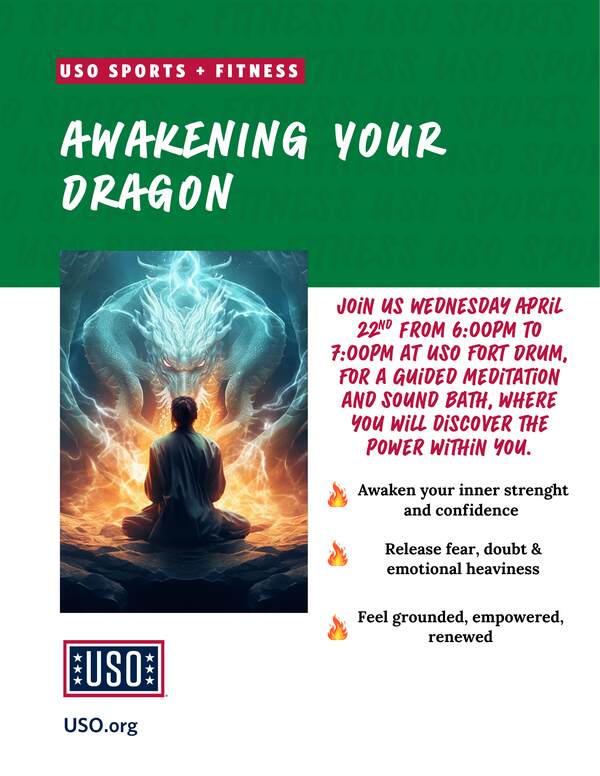 Join us Wednesday April 22nd from 6:00pm to 7:00pm at USO Fort Drum, For a guided Meditation and Sound Bath, where you will discover the power within you. Awaken your inner strength and confidence, release fear, doubt & emotional heaviness, to start feeling grounded , empowered, renewed.