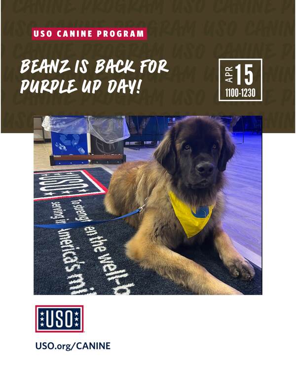 We are excited to welcome back BEANZ to our Fort Drum USO center, in time for Purple Up Day! BEANZ is a registered therapy dog and he’s especially excited to spend time with service members and their families as we celebrate the Month of the Military Child.